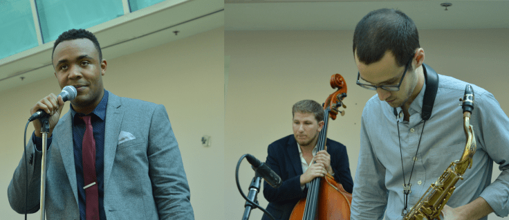 Hyde Park Jazz Festival 2016: Katie Ernst (top left) with Kevin Falzone of “Wayfaring”. Dustin Laurenzi (bottom far right) with Quentin Coaxum and Andrew Vogt. Photos by Dominic Guanzon.