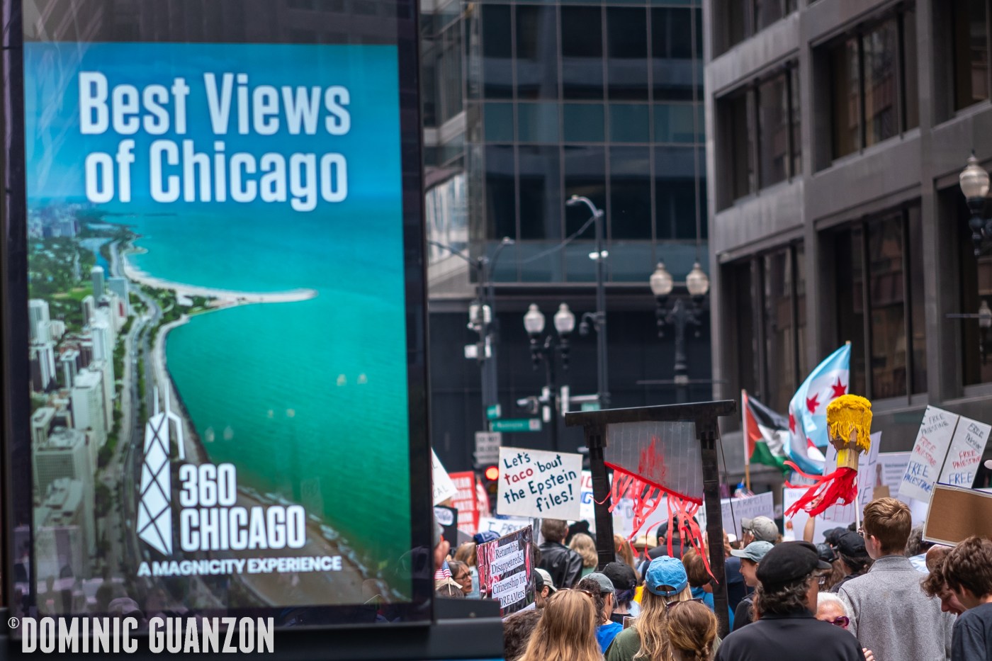 An electronic billboard advertisement for the Sears Tower‘s observation platform saying “Best Views of the Chicago” on Dearborn St overlooking a Washington Blue Line stop, contrasted with a protest art piece in the crowd. The crowd spilled out of Daley Plaza and into surrounding streets. 6/14/25.