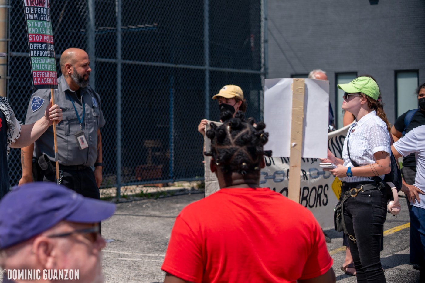 Protest marshals in yellow vests – including some of the speakers, chant leaders, and organizers – were present. Legal observers from the National Lawyers Guild were also in attendance, keeping track of both the security guards, the gate situation, and the moderate presence from the Broadview Police Department on the street.