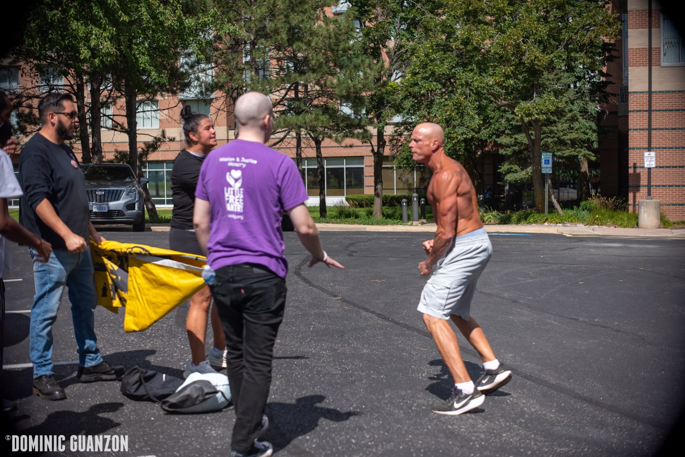 The first of two separate instigators. The instigator was seen walking in and out of the crowd, moving into people’s faces, and flexing his torso in an attempt to provoke a reaction. Downers Grove, 9/7/25.