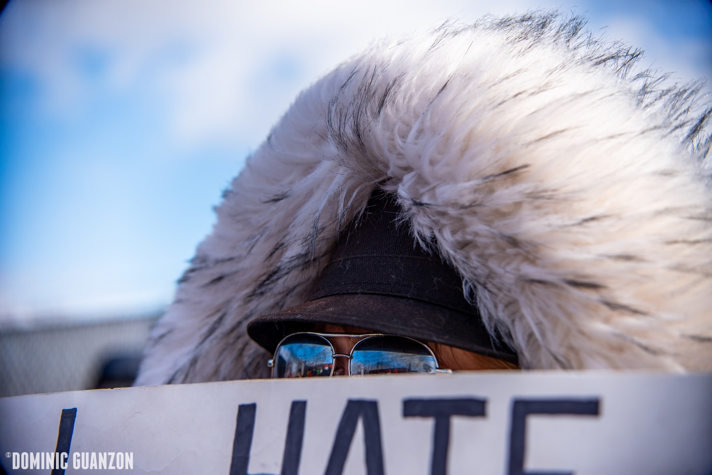 A protester in shades, a trilby (meant to mimic The Blues Brothers), and a thick hooded coat holds a sign up to their face to protect from the wind: “I HATE ILLINOIS NAZIS” [out-of-frame]. Broadview, 1/17/26.